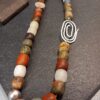Diese einzigartige Edelsteinkette besticht durch ihre matt geschliffenen Steine in sanften, harmonischen Farben. Die Edelsteine in tonnenförmiger Gestalt verleihen der Kette eine natürliche Eleganz, während ihre unterschiedlichen Größen – mit einer Länge von 11 bis 16 mm und einer Breite von etwa 14 bis 16 mm – jedem Stück eine individuelle Note verleihen. Der handgefertigte Verschluss aus edlem 925er Silber, kunstvoll geschmiedet, setzt einen markanten Akzent und verbindet klassische Handwerkskunst mit zeitloser Schönheit. Silberne Details, wie die fein gearbeitete Kugel und die elegante Silberscheibe, vollenden das Design und machen die Kette zu einem wahren Unikat, das Modernität und Tradition in perfekter Harmonie vereint.